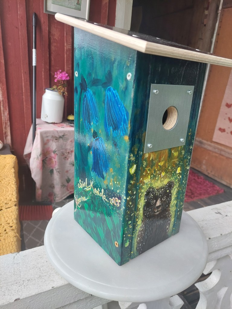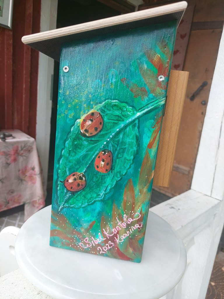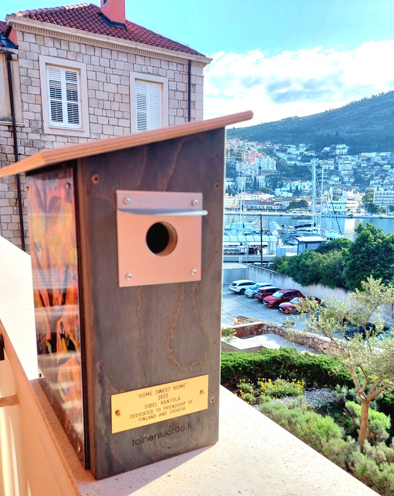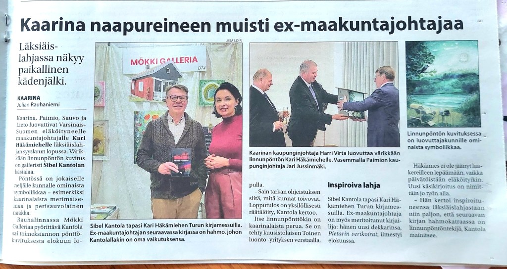 City of Kaarina with these municipalities like Paimio, Lieto and Sauvo has ordered a birdhouse that will reflect them, and the receiver Kari Häkämies, who was becoming retired from his duty will be receiving this gift. I used the bird jackdaw that represents Sauvo. Then we have Alvar Aalto’s Paimio char. Lieto’s logo is on the coffee mug. And the sea view is reflection view of the Kaarina city. The illustration had to look like a detective book cover such as the Kari Häkämies as a writer of several detective stories.
